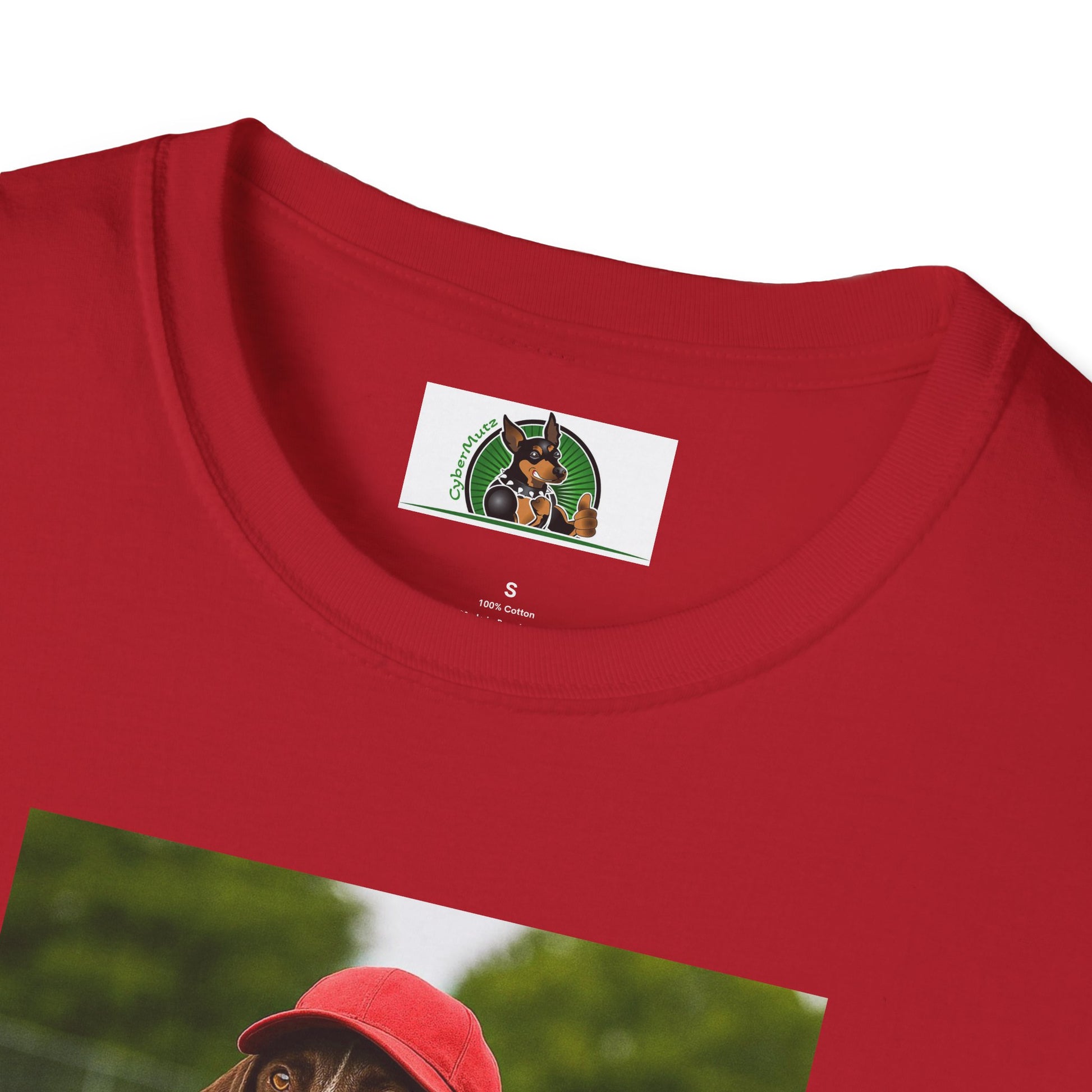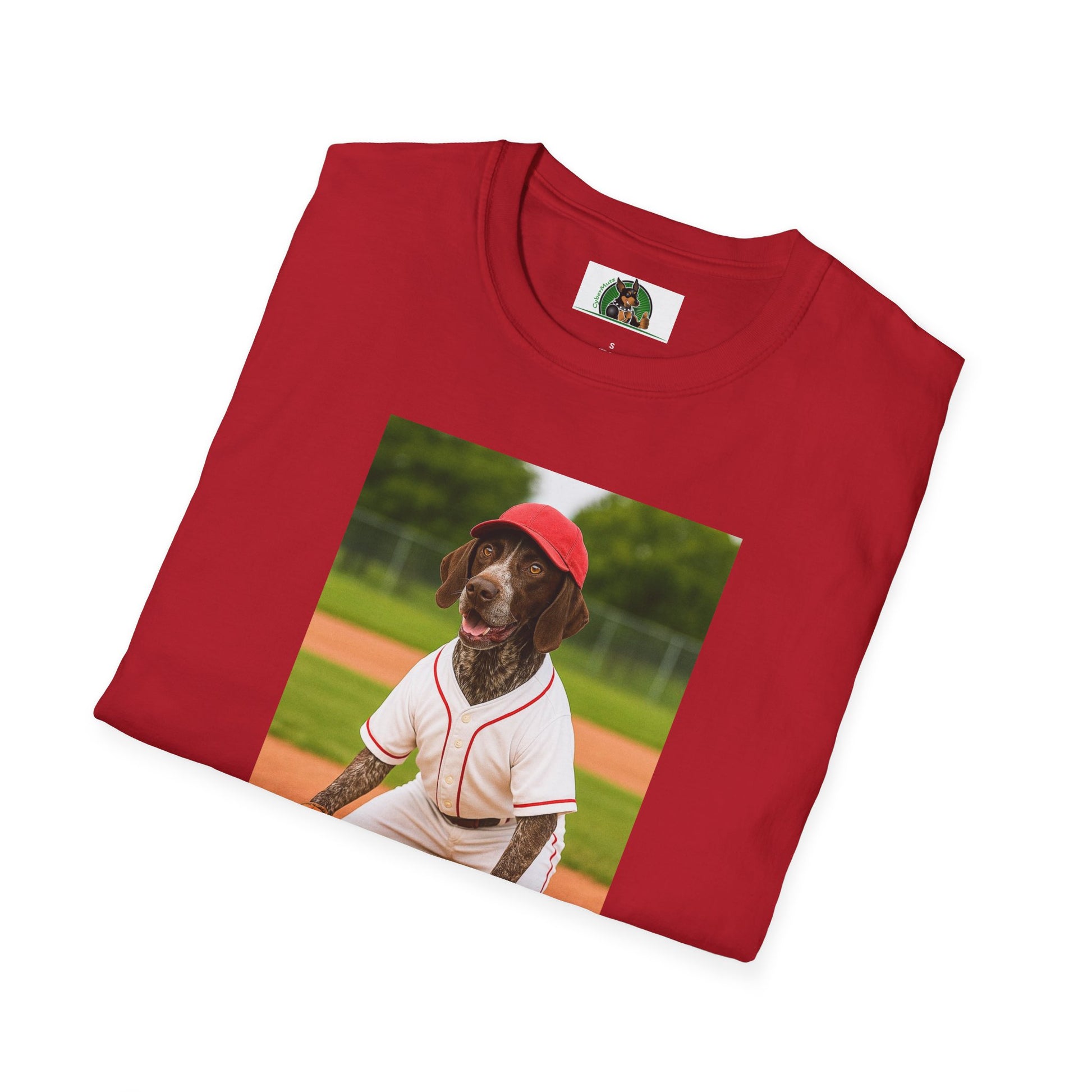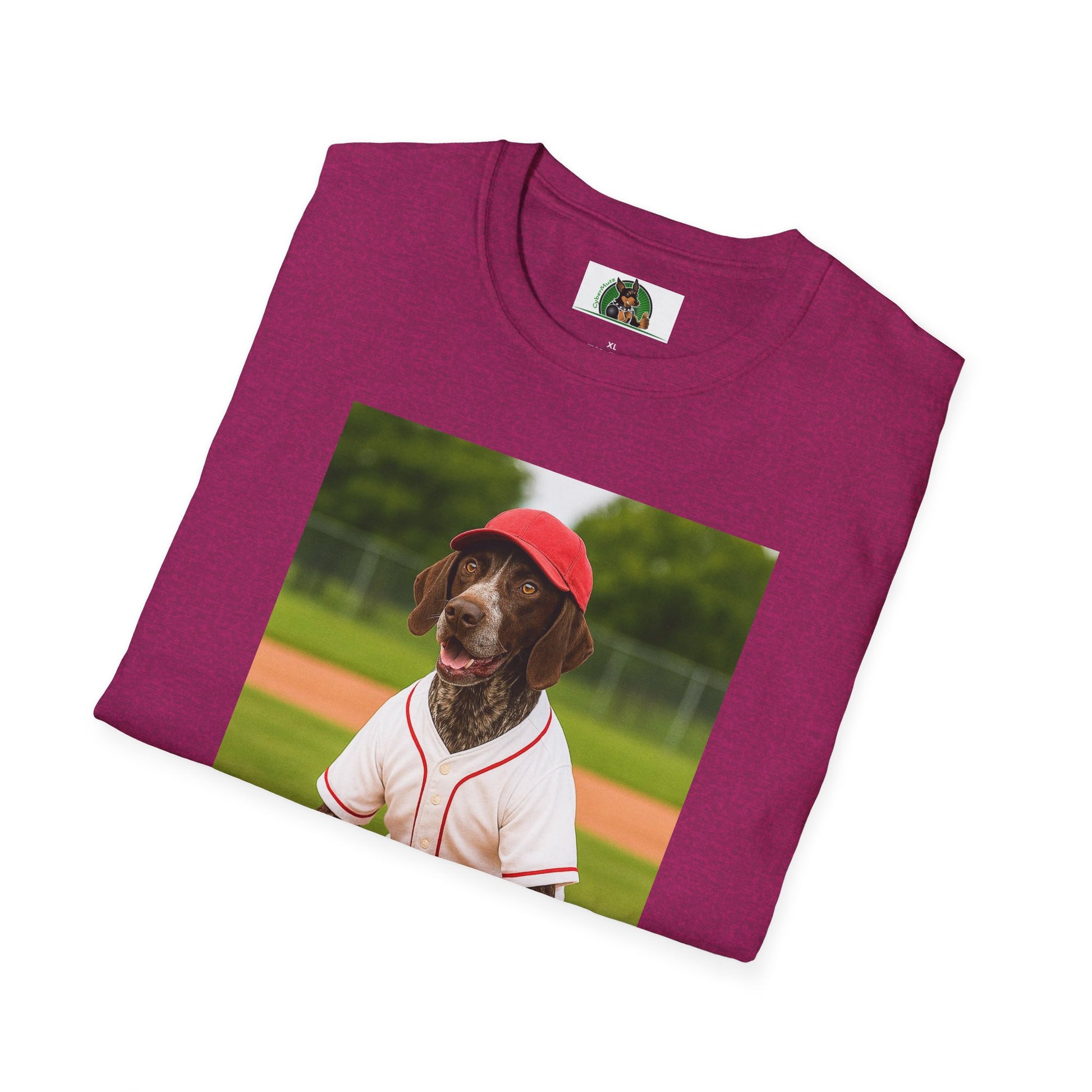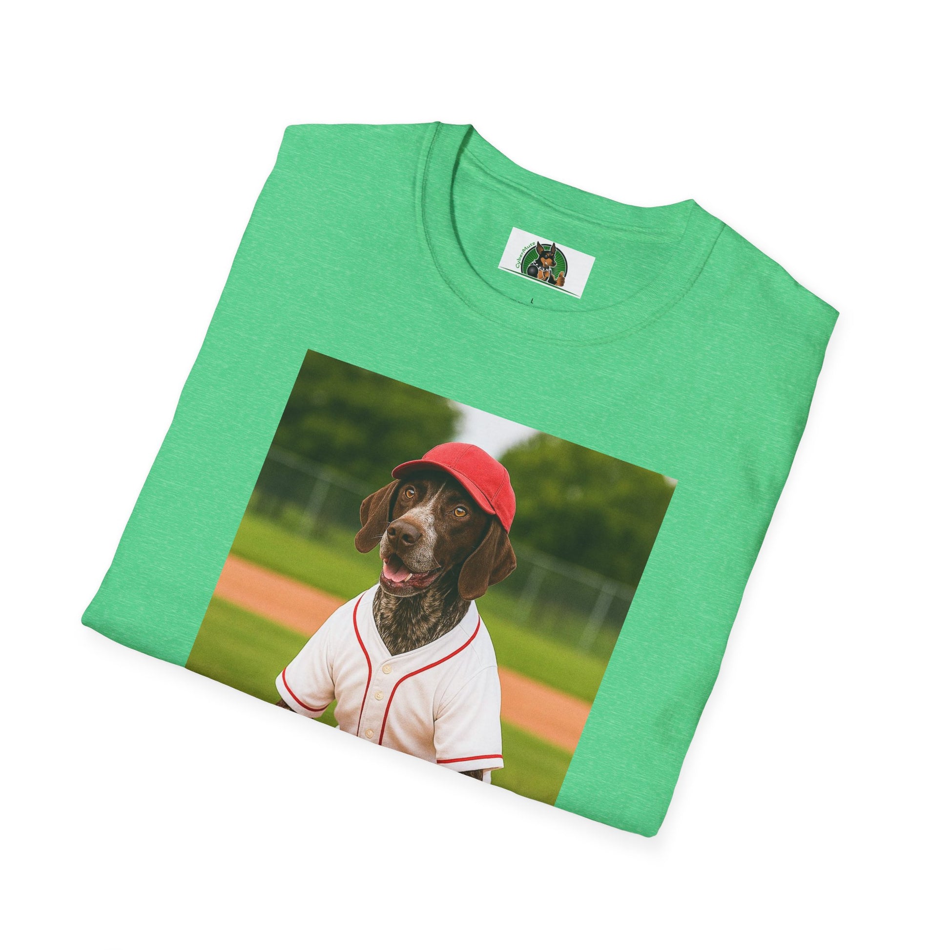A sporty T-Shirt featuring a design of a German Shorthair playing baseball. This T-Shirt gives off a fun and athletic vibe, perfect for sports enthusiasts and dog lovers. It is a great addition to casual outfits and can be worn for game days, outdoor activities, or just lounging around.