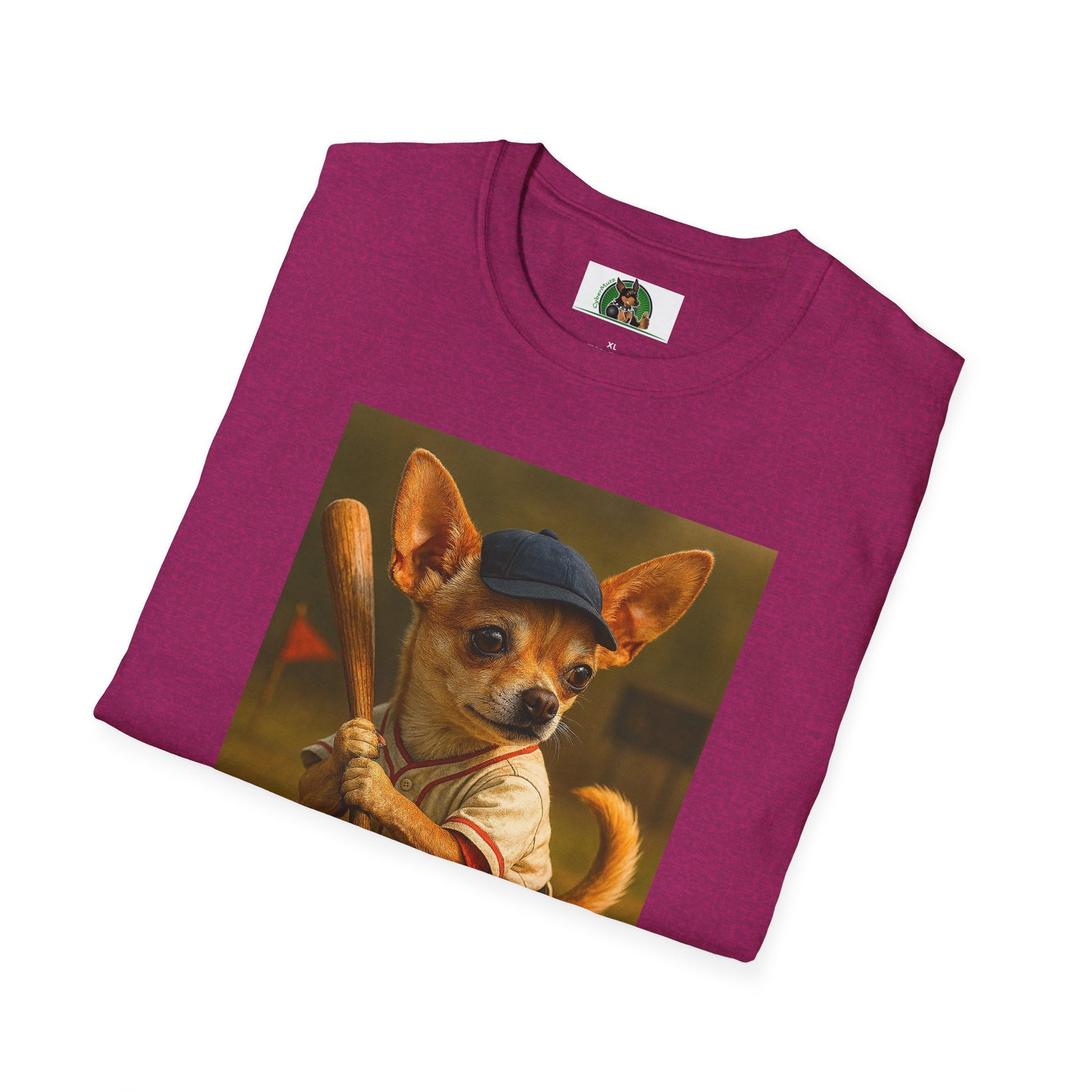 A Chihuahua sports playing baseball design printed on a soft and durable unisex T-Shirt. Perfect for dog lovers and baseball fans, this T-Shirt exudes a fun and playful vibe. Ideal for casual wear or as a gift for pet owners and sports enthusiasts. Relevant for birthdays, sports events, and pet-related holidays.