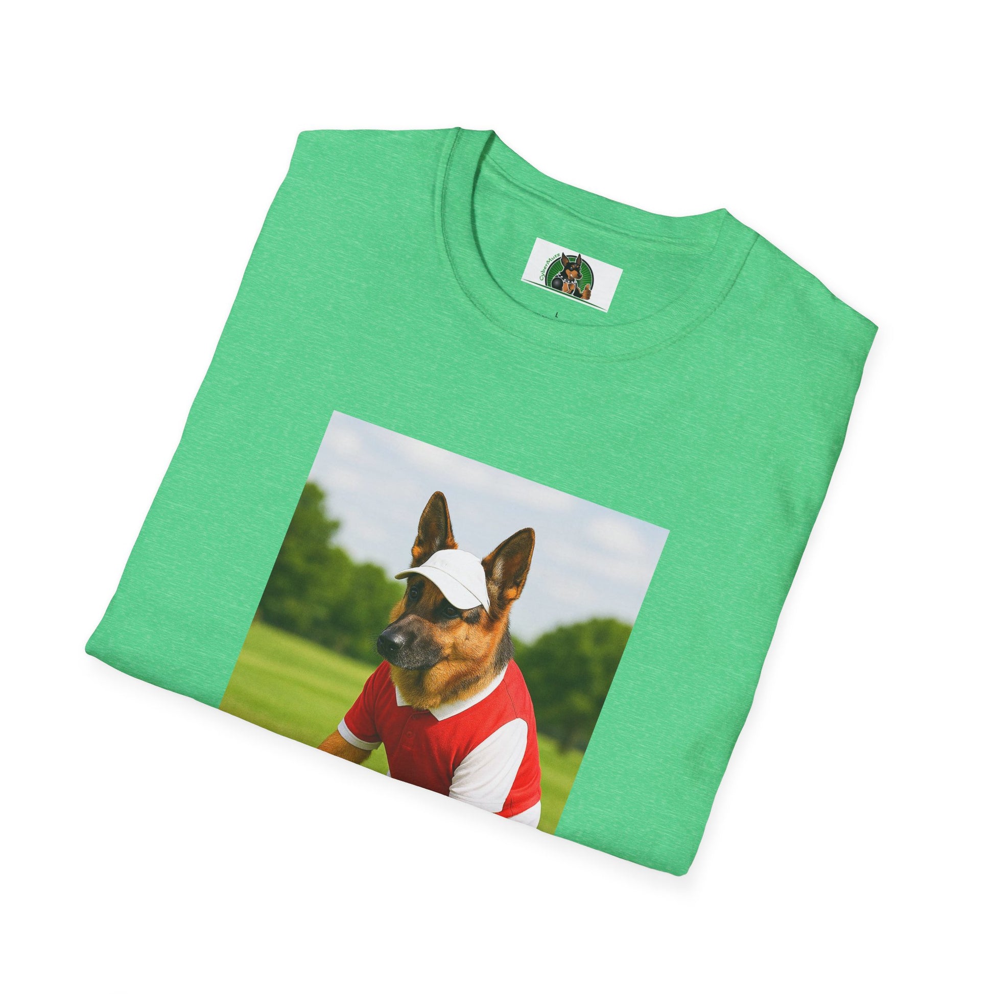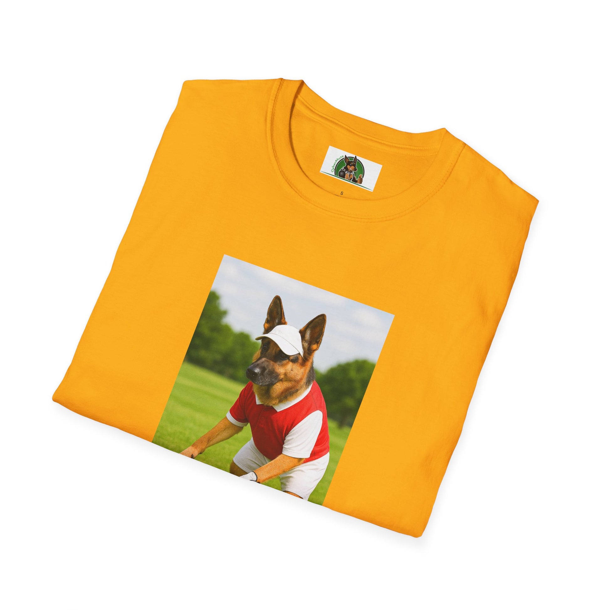 A fun and distinctive T-Shirt featuring a German Shepherd playing Golf, perfect for sports enthusiasts or dog lovers. This tee exudes a playful and active vibe, making it ideal for casual wear or sports events. Great for dog owners, golfers, and sports fans. Perfect for gift-giving on birthdays, Christmas, or Father's Day.
